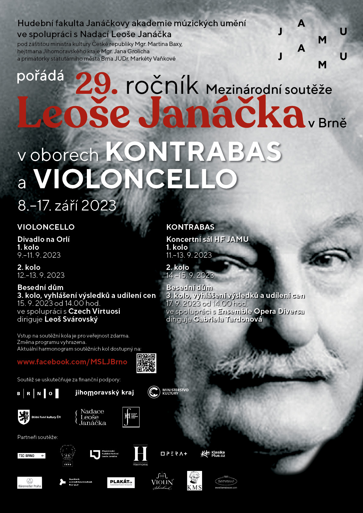 Hudební fakulta Janáčkovy akademie múzických umění (HF JAMU) každoročně pořádá prestižní Mezinárodní soutěž Leoše Janáčka v Brně. Letošní 29. ročník této interpretační soutěže v oborech kontrabas a violoncello se koná ve dnech 8.–17. září. Finálová kola soutěže se konají v pátek 15. září v oboru violoncello a v neděli 17. září v oboru kontrabas v Besedním domě v Brně, kde soutěžící vystoupí za doprovodu orchestru Czech Virtuosi pod taktovkou dirigenta Leoše Svárovského a orchestru Ensemble Opera Diversa s dirigentkou Gabrielou Tardonovou.